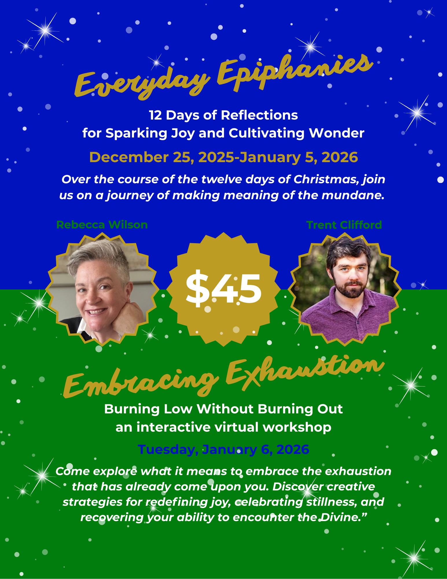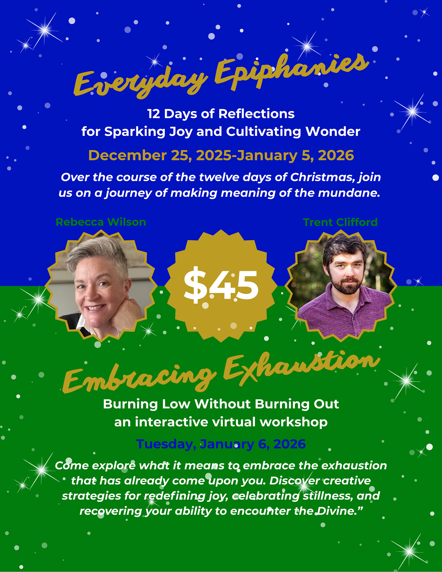It’s not too late to sign up for Everyday Epiphanies. Trent Clifford and I are offering a two part package. 12 days of Christmas reflections + 1 interactive virtual workshop. More information on the flyer. Click the link to gift this experience to yourself and a friend!